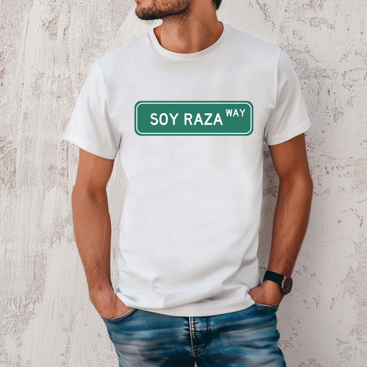 Soy Raza Street Sign Graphic Tee - Proud Latino Heritage Shirt | Camiseta con Orgullo y Cultura