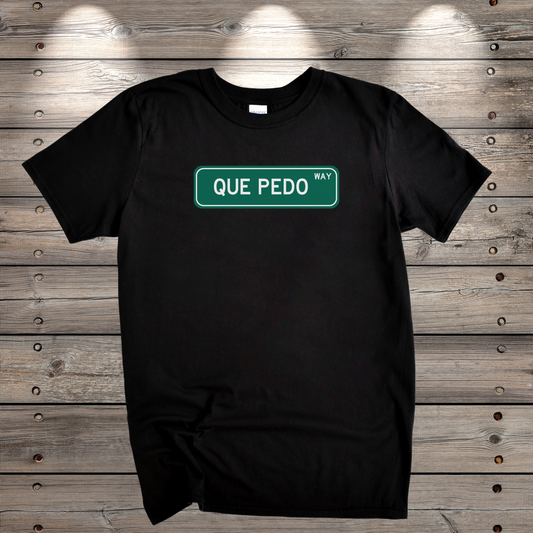 Qué Pedo Street Sign Graphic Tee - Funny Mexican Slang Shirt | Camiseta Divertida con Frase Icónica