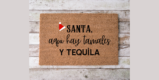 Santa, Aquí Hay Tamales y Tequila Doormat – Funny Latino Christmas Mat | Spanglish Holiday Decor | Handmade 18x30 Door Mat