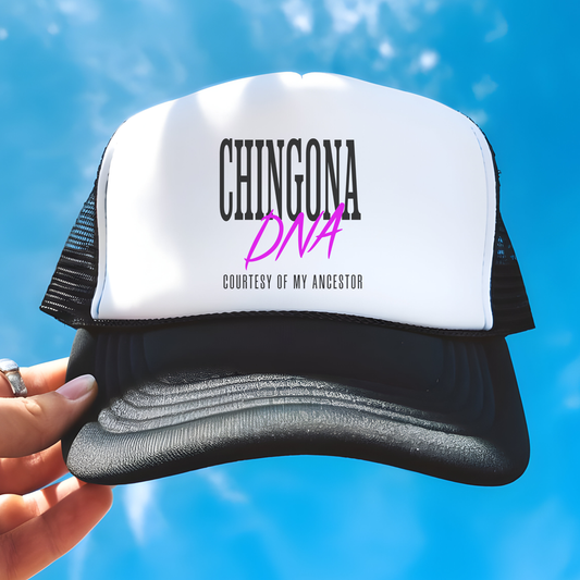 Chingona DNA Trucker Hat – Gorra Negra con Orgullo Ancestral y Estilo