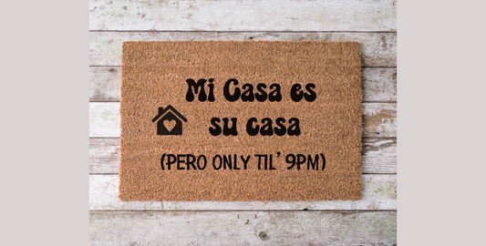 Mi Casa Es Su Casa But Only Til 9PM – Funny Spanglish Doormat | Bilingual Latinx Home Decor – Handmade Coco Mat