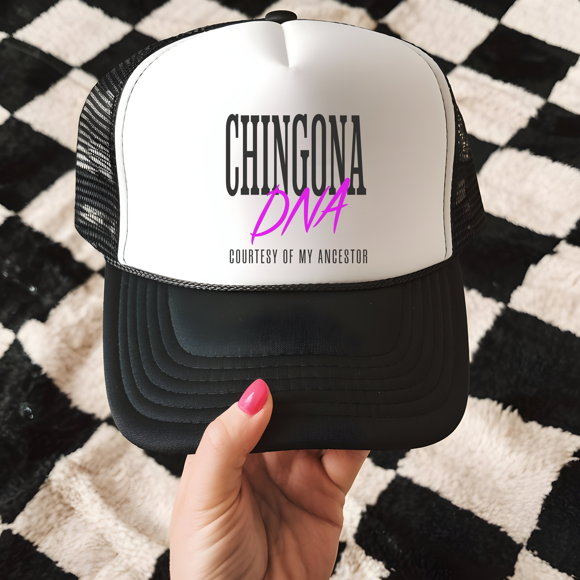 Chingona DNA Trucker Hat – Gorra Negra con Orgullo Ancestral y Estilo
