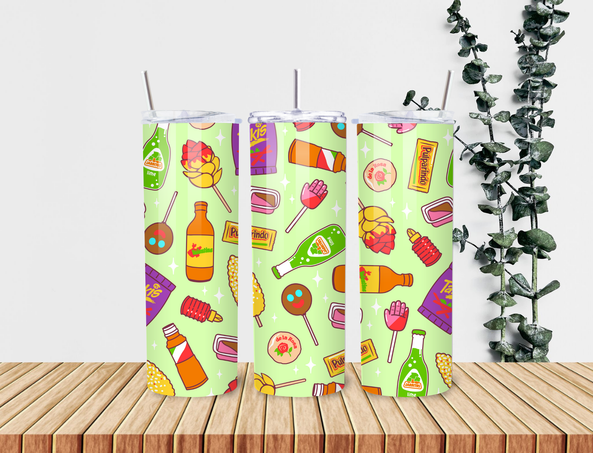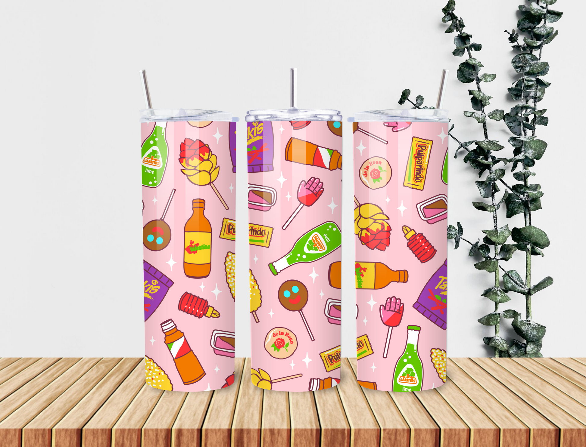 This tumbler is a full-on fiesta of sabor and memories. Featuring iconic Mexican treats like Pelón, Takis, De la Rosa, Paletas Payaso, Jarritos, Chamoy, Pulparindo and más — this design brings all your fave antojitos into one colorful, adorable cup.