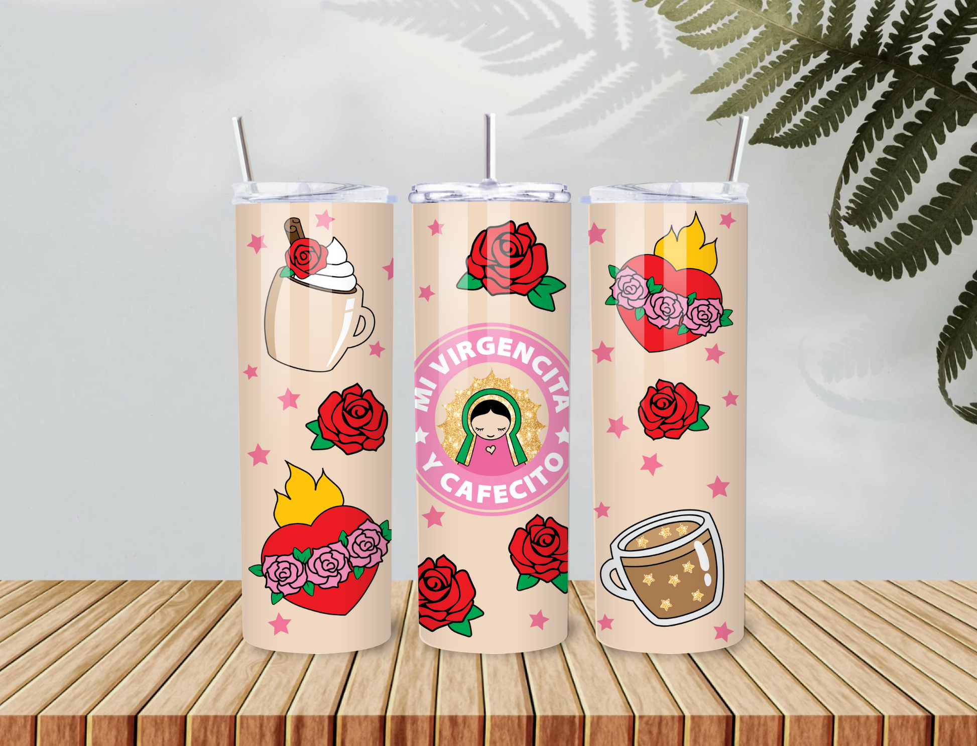 Mi Virgencita y Cafecito Tumbler – 20oz Faith & Coffee Cup with Roses, Latina Style & Spiritual Vibes